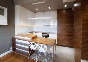 Gdy zastanawiamy się nad ciemną zabudową kuchenną ale boimy się wizualnego zmniejszenia pomieszczenia, szklane fronty szafek będą doskonałym pomysłem. Złagodzą ciężar ciemnych przytłaczających kolorów oraz zapewnią przejrzystość i lekkość pomieszczeniu.