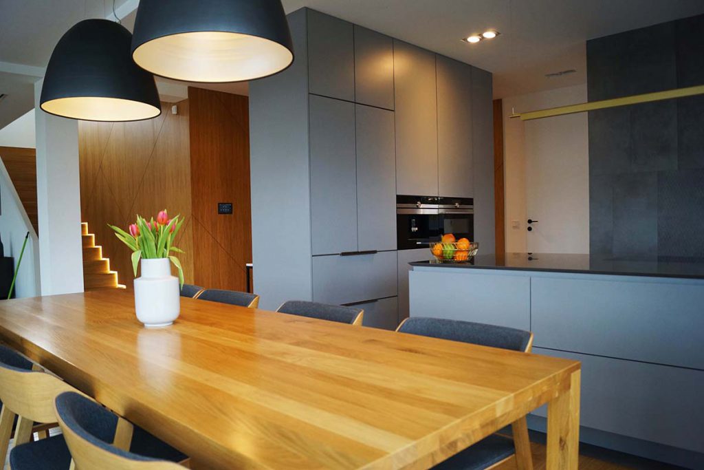 Część kuchni można zagospodarować na pełnowymiarową jadalnię. Swobodnie mieszczącą wszystkich domowników i gości. Do pokaźnej kuchni można nawet wstawić ławę z dużą ilością poduszek tworząc przyjemny wypoczynkowy kącik. Zazwyczaj robi się tak, gdy kuchnia na wymiar jest połączona z salonem zyskuję się wtedy łagodne przejście między pomieszczeniami.