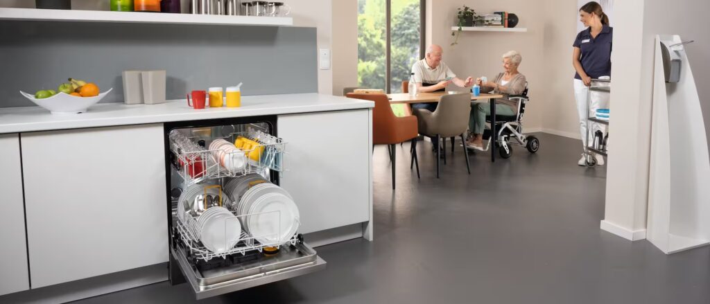 Naczynia takie jak szklanki, talerze czy pojemniki na jedzenie muszą być dobrze umyte i wyparzone. Ale nie tylko, także na co dzień używane sztućce oraz obrusy. Czystość tych elementów i ich gotowość do ponownego użycia jest bardzo ważna w domach opieki i seniora. Miele Professional przygotowało odpowiedni sprzęt do zmywania. Zapewniają wysoką jakość przy użyciu poprzez tak zwane systemy zbiornikowe. Firma posiada w ofercie zmywarki kapturowe z systemem przelotowym koszy. Oraz takie ładowane od przodu. Urządzenia mają bardzo krótkie cykle trwające nawet 47 sekund. To niesamowita szybkość, a do tego nieskazitelna higiena w jednym. Oczywiście Miele ma też do kompletu odpowiednie środki czyszczące.